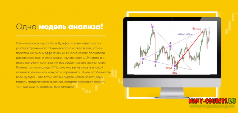 Отличительная черта Волн Вульфа от всем известного и распространенного технического анализа в том, что он простой, но очень эффективный. Многие из вас прочитали достаточно книг о теханализе, изучили волны Эллиота и в итоге получили кучу знаний без эффективного применения. Почему так происходит? Потому что вы не знаете в какой момент времени что конкретно применять. В чем особенность волн Вульфа - это в том, что вы будете использовать одну модель графического анализа, которая позволяет входить там, где другие анализы беспомощны.